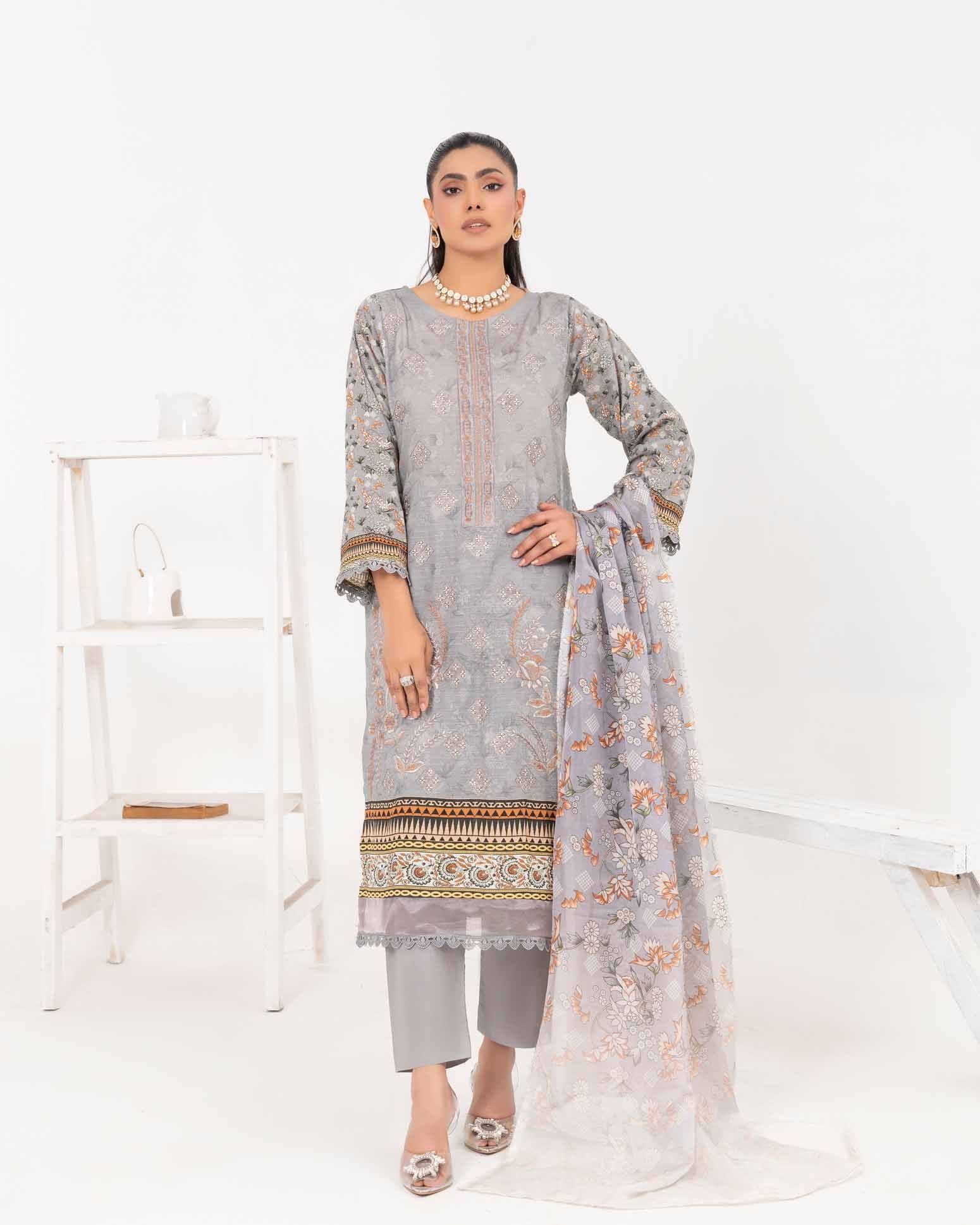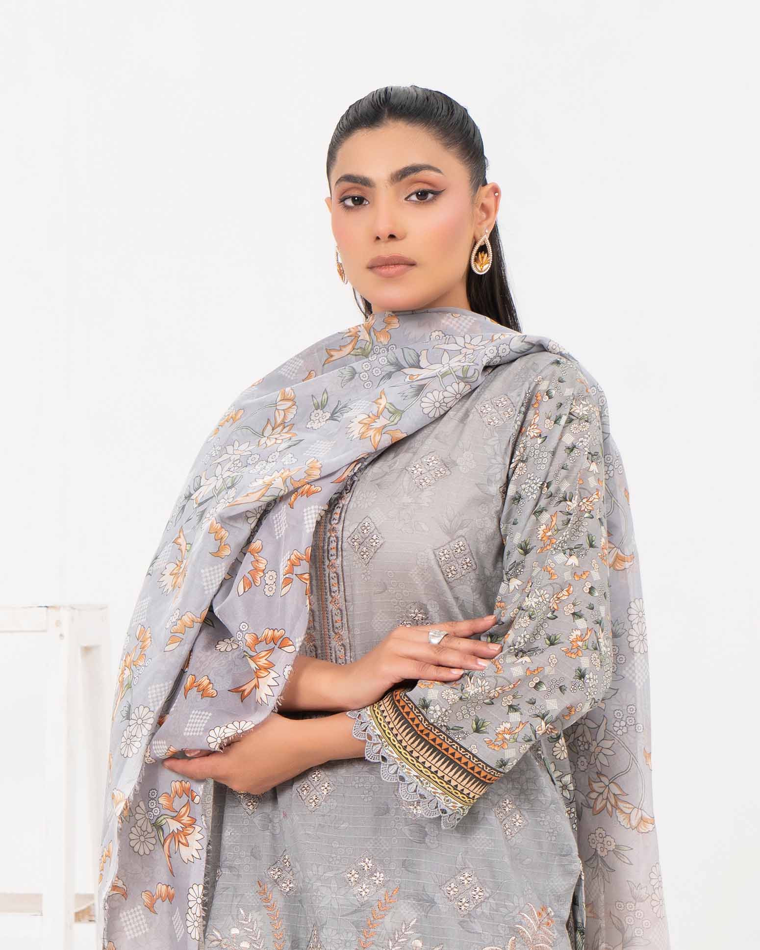 Printed and embroidered Bana Dora lawn shirt meets a flowing silk dupatta with elegant printwork. Paired with dyed plain trousers...