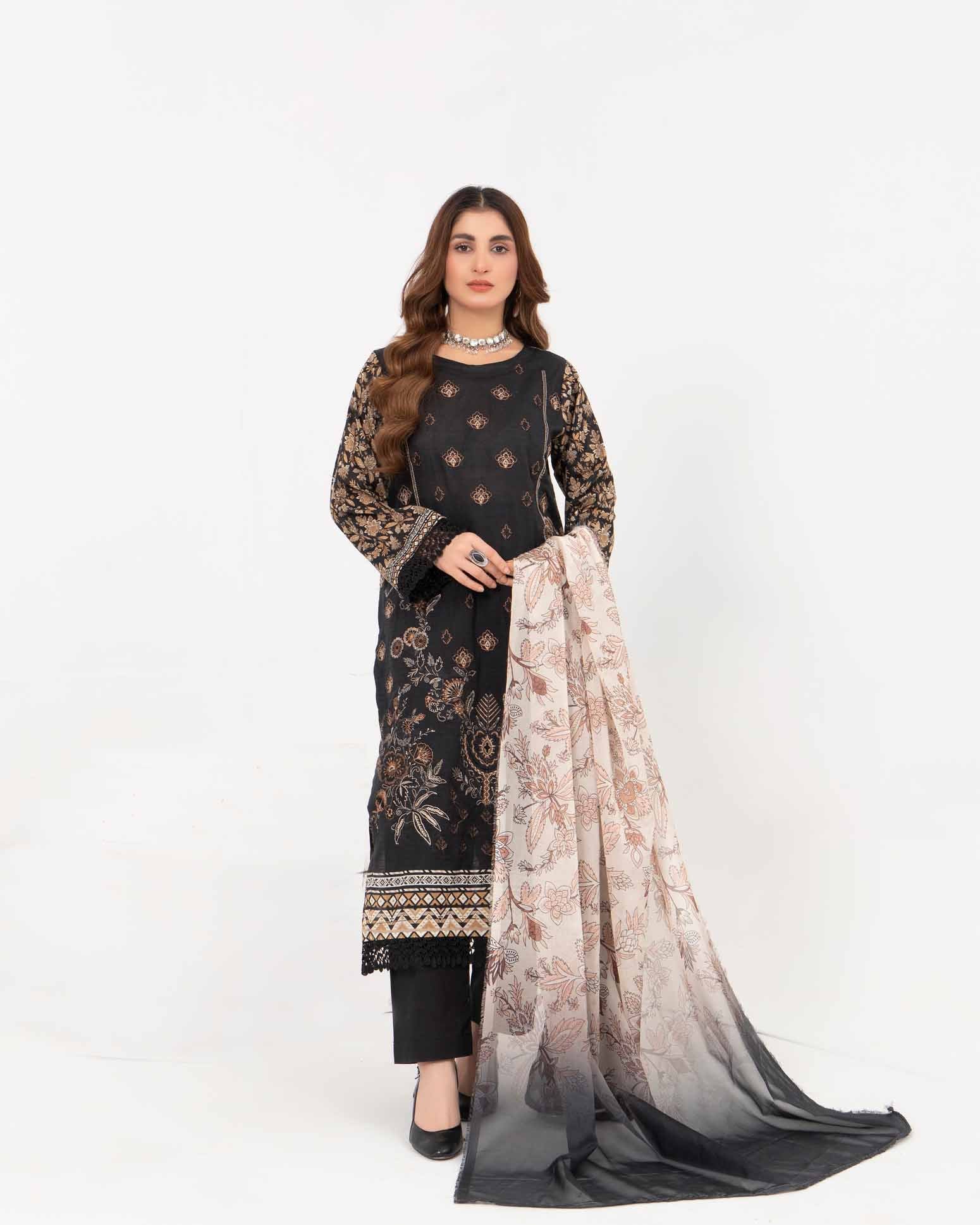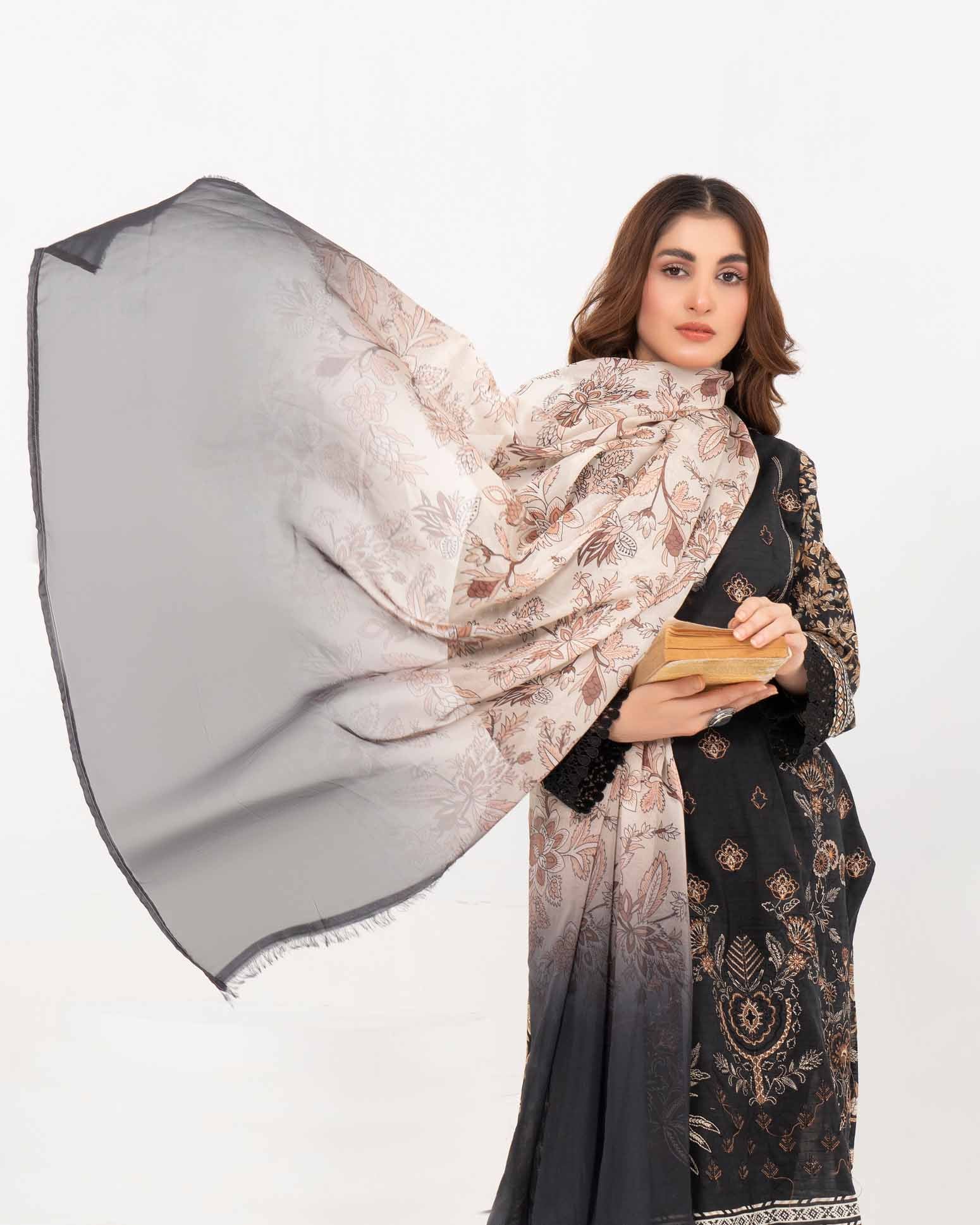 This three-piece includes a printed Bana Dora lawn shirt detailed with tonal embroidery. Paired with a fancy silk dupatta that...