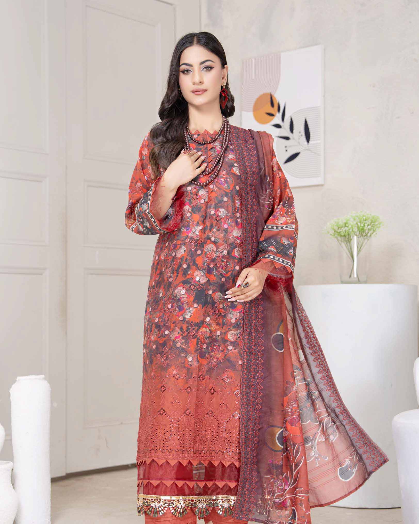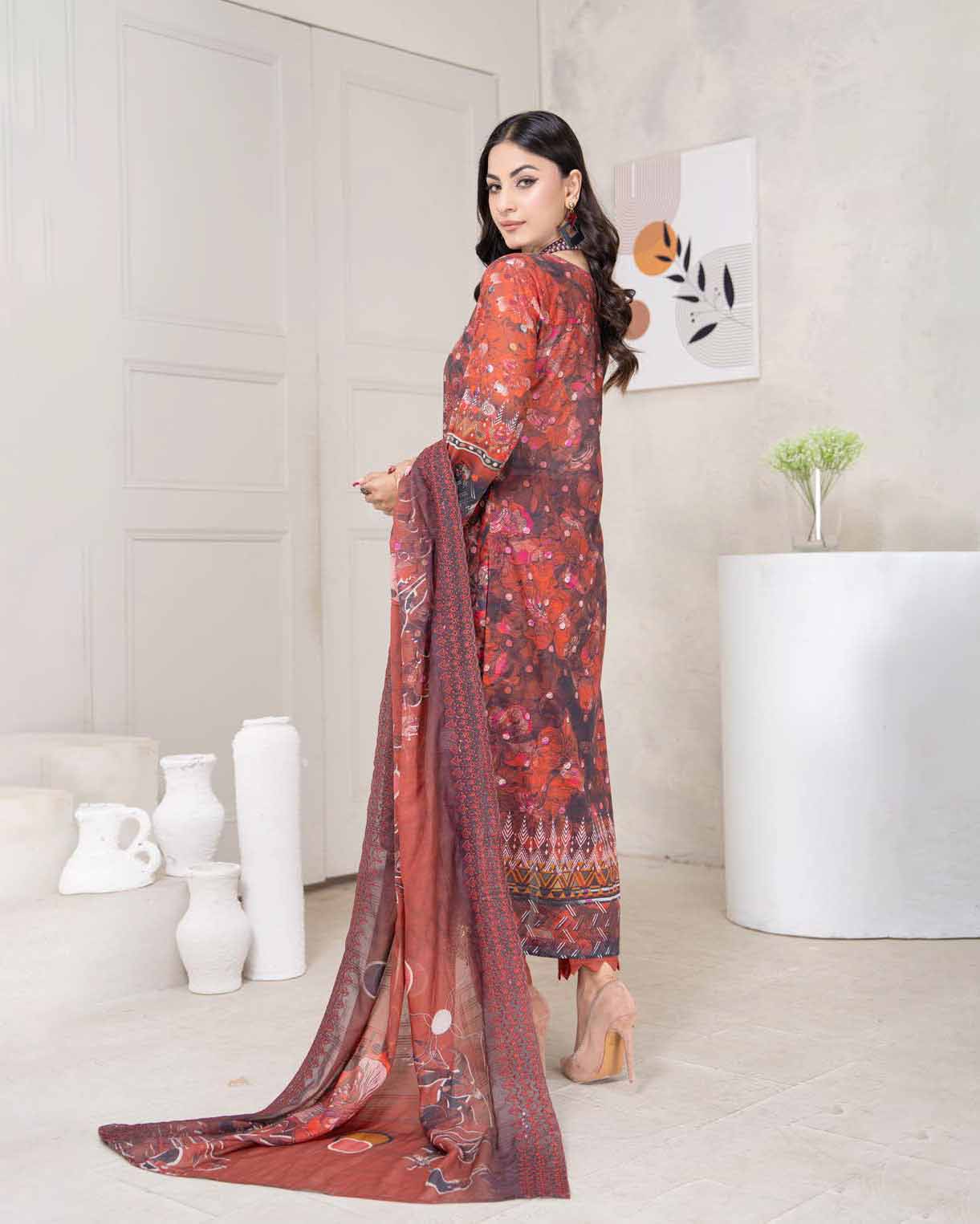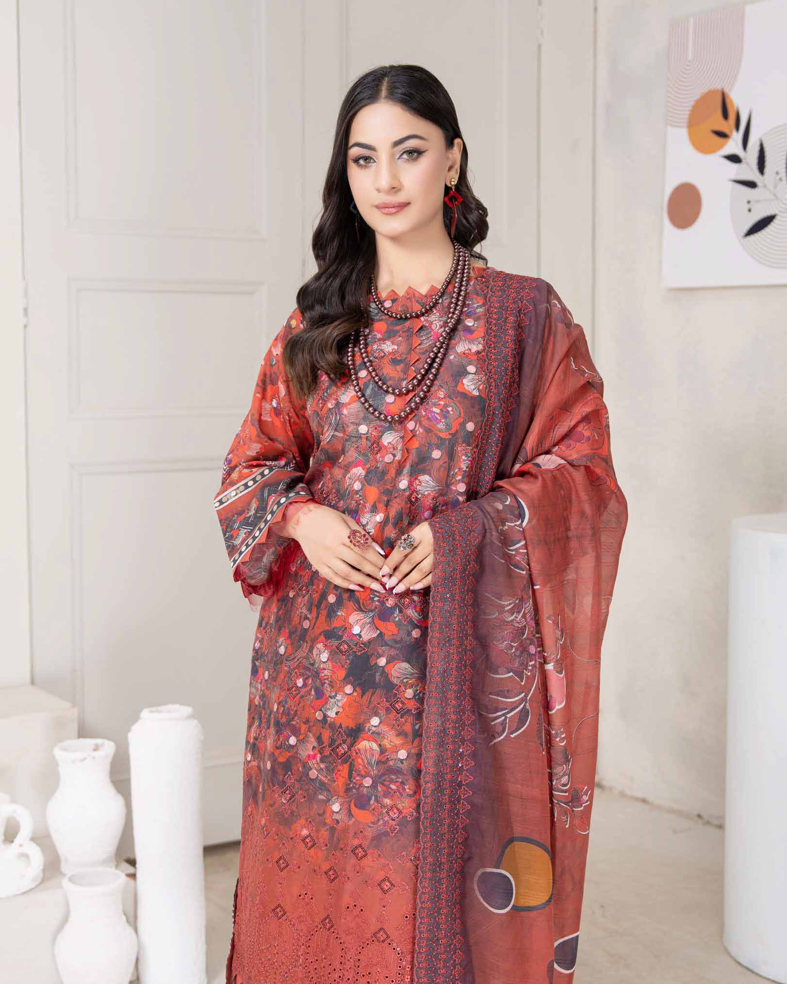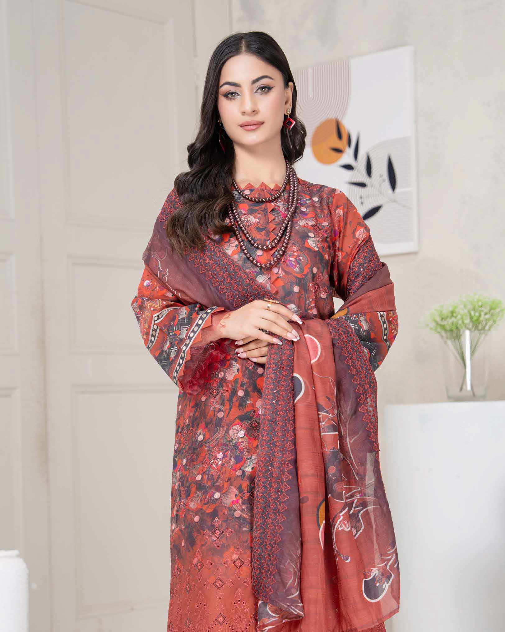 This three-piece suit pairs a digitally printed shirt with embroidery along the front and a textured daman edge. The result...