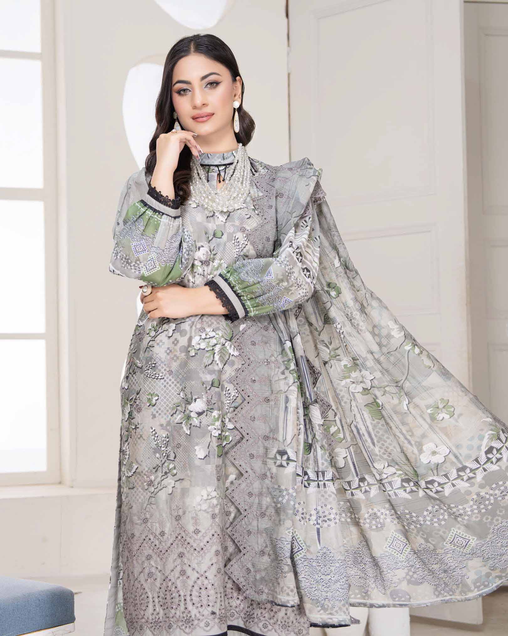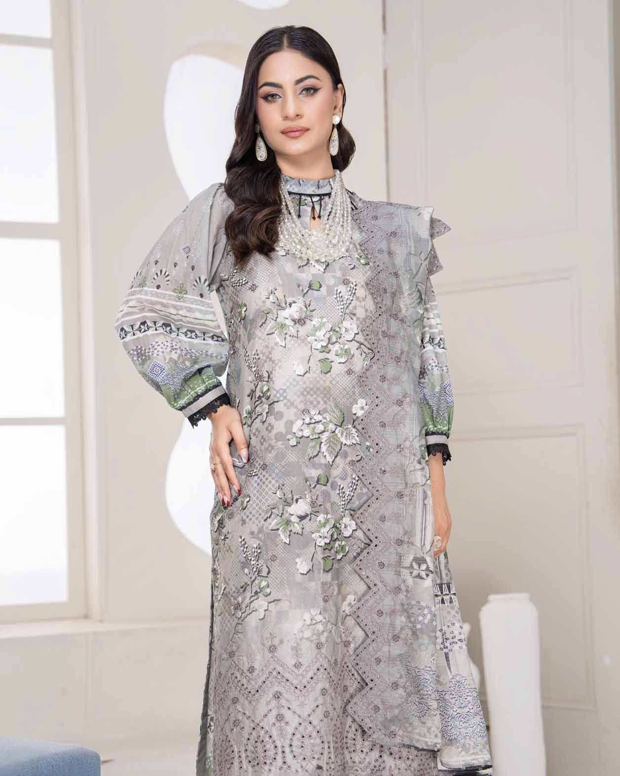 A digitally printed shirt with embroidery that defines the neckline and flows through the daman for a grounded yet light...