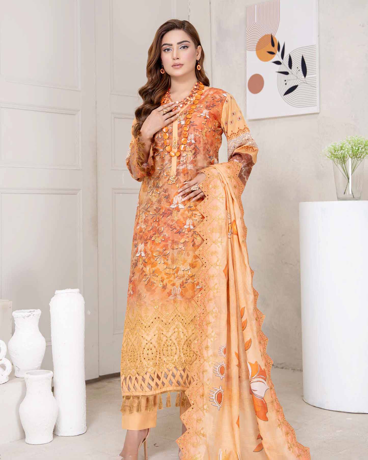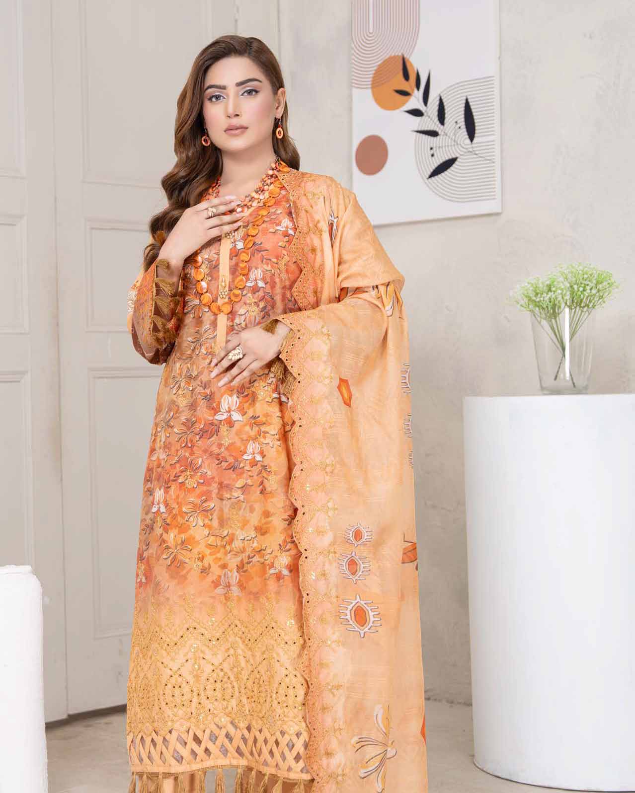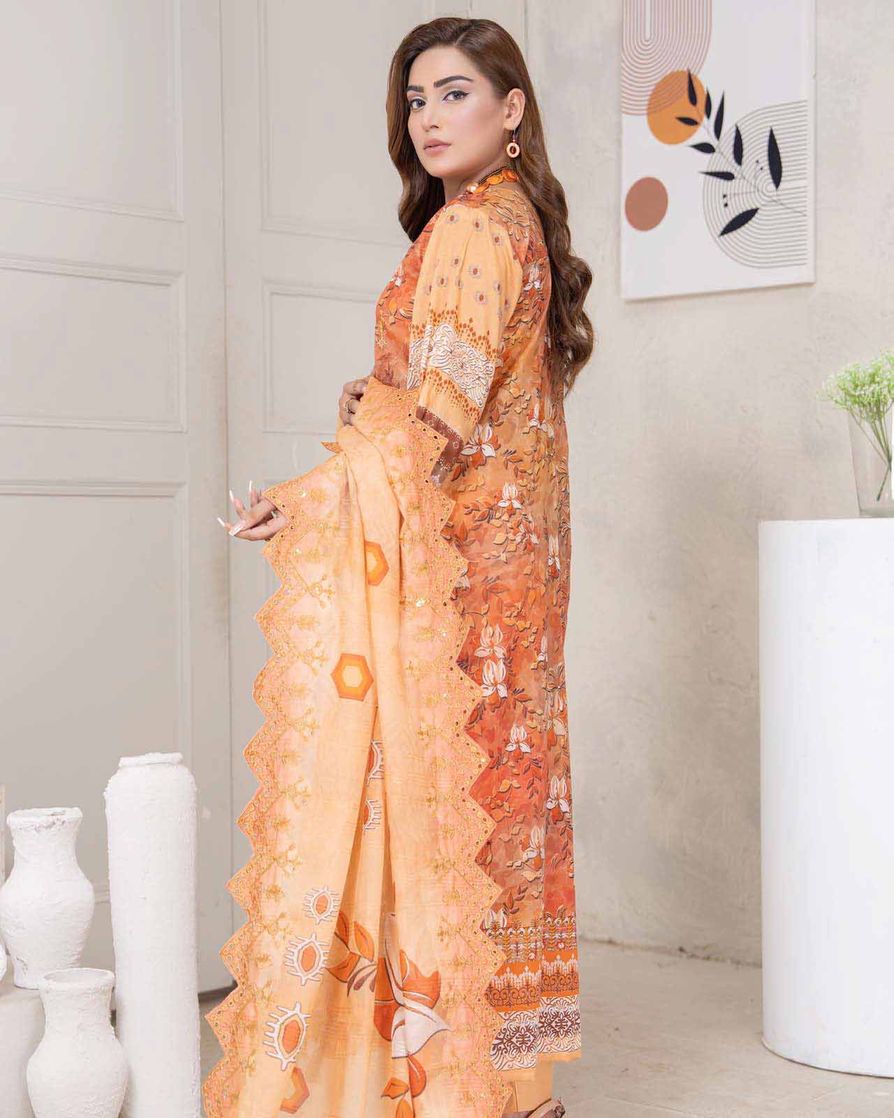 This three-piece set combines digitally printed lawn with embroidery across the front and daman for thoughtful detail. The voile dupatta...